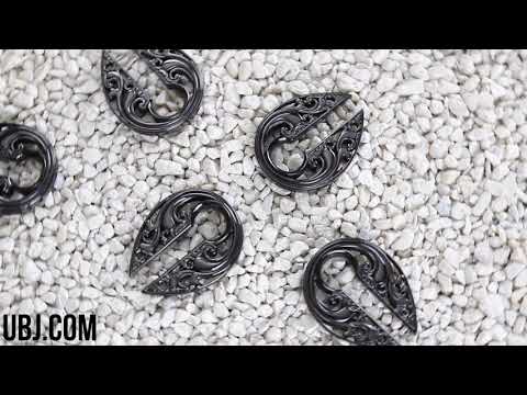 Sold in pairs (2pc) Hand made 30g each 1/2" or bigger to wear Height: 1 & 3/4" (45mm) Width: 1 & 1/2" (38mm) Black PVD 316L stainless steel