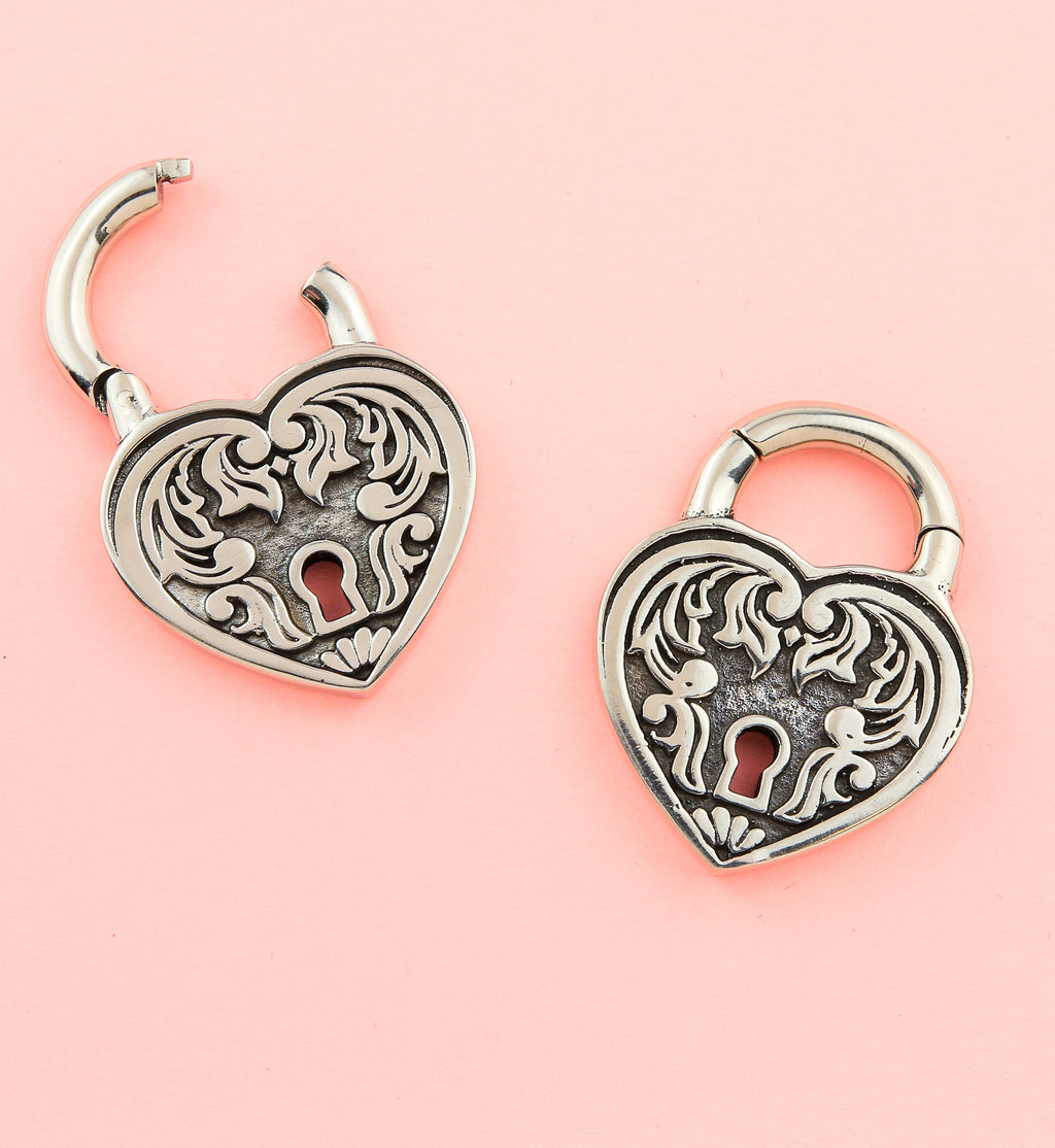 Ornate Heart Lock White Brass Hinged Ear Weights