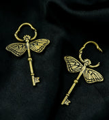 Charming ear weights that are made from yellow brass and have a dragonfly key design. They are size 8G (3.2mm) so must be 8G or bigger to wear. Brass is not meant for long term wear, it may oxidize under extreme moisture conditions. These have a hinged design that opens and clicks closed. Full size is about 60mm x 40mm. For healed piercings/lobes. Sold in pairs (2pcs).
