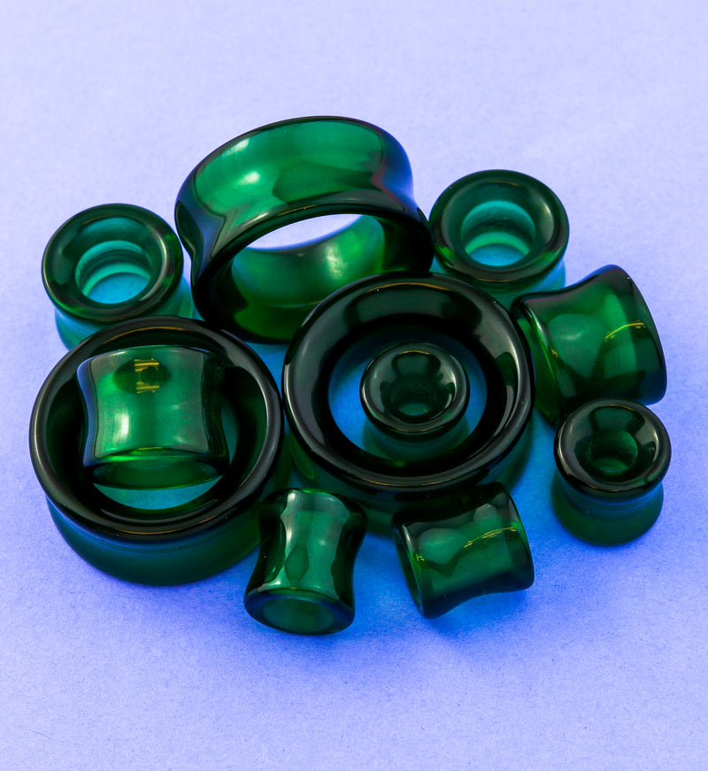 Get your stunning Double Flare Emerald Green Glass Tunnel Plugs in any of the following sizes: 2 gauge (6mm), 0 gauge (8mm), 00 gauge (10mm), 7/16" (11mm), 1/2 inch (12mm), 9/16 inch (14mm), 5/8 inch (16mm), and 3/4 inch (19mm), 7/8", 1 inch, 1 & 1/8", 1 7 1/4", 1 & 3/8", 1 & 1/2", 1 & 5/8", 1 & 3/4", 1 & 7/8", 2".