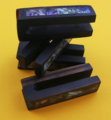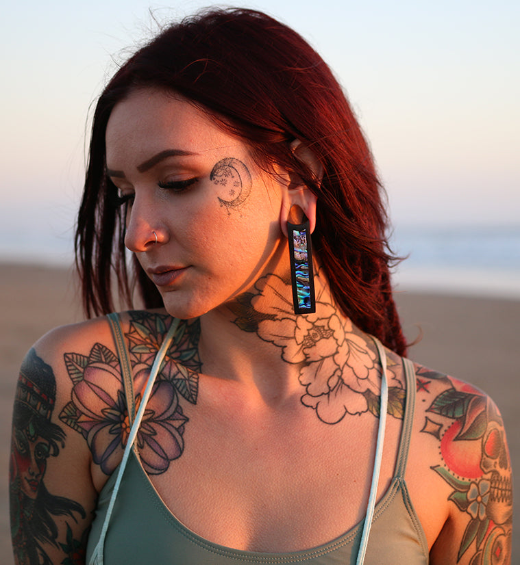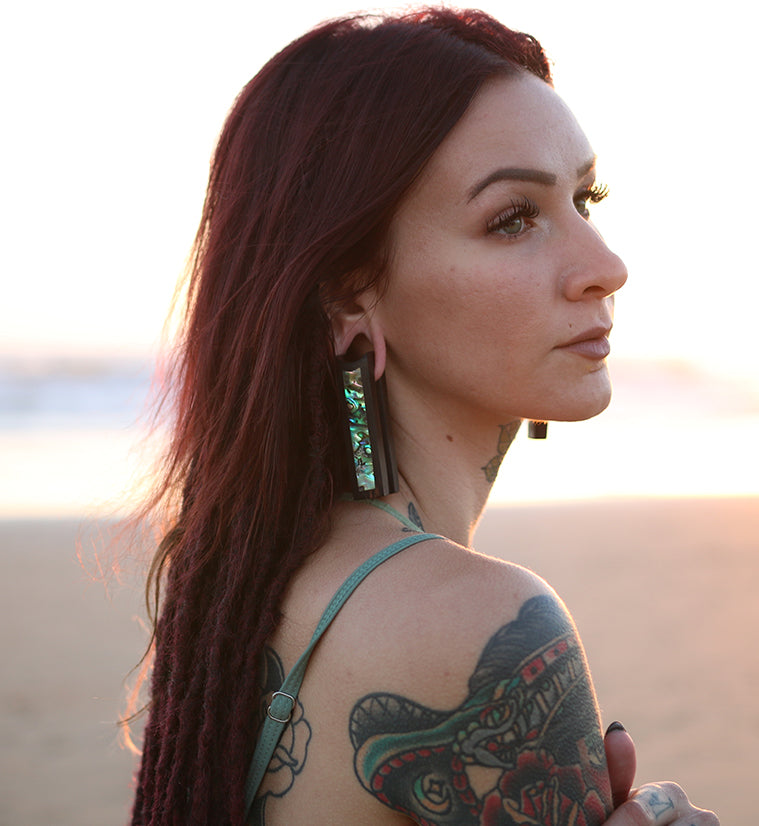 These Tower Areng Wood Ear Weights with Abalone Shell Inlay are beautifully handcrafted to last. Sold in pairs in two sizes - Small (12.5g, 50mm height by 14mm width) and Large (24g, 75mm height by 18mm width) - each piece must be 9/16” (14mm) or larger to wear. These ear weights feature natural areng wood and abalone shell inlays. Please note that the large size may have some cracks in the shell.