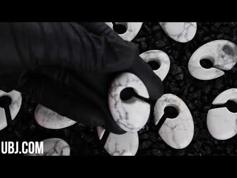 Sold in pairs (2pc) 11.5 grams each Howlite stone Height: 38mm (1 & 1/2") Width: 25mm (1 inch) 0G (8mm) or bigger to wear