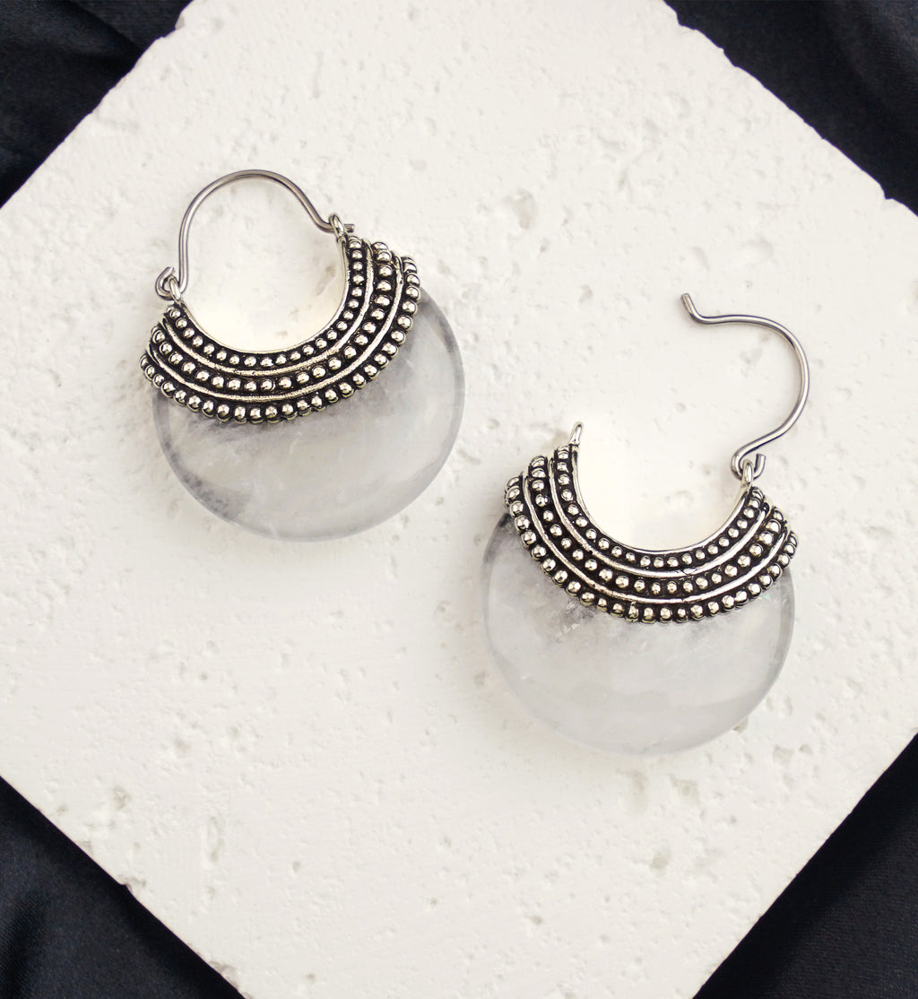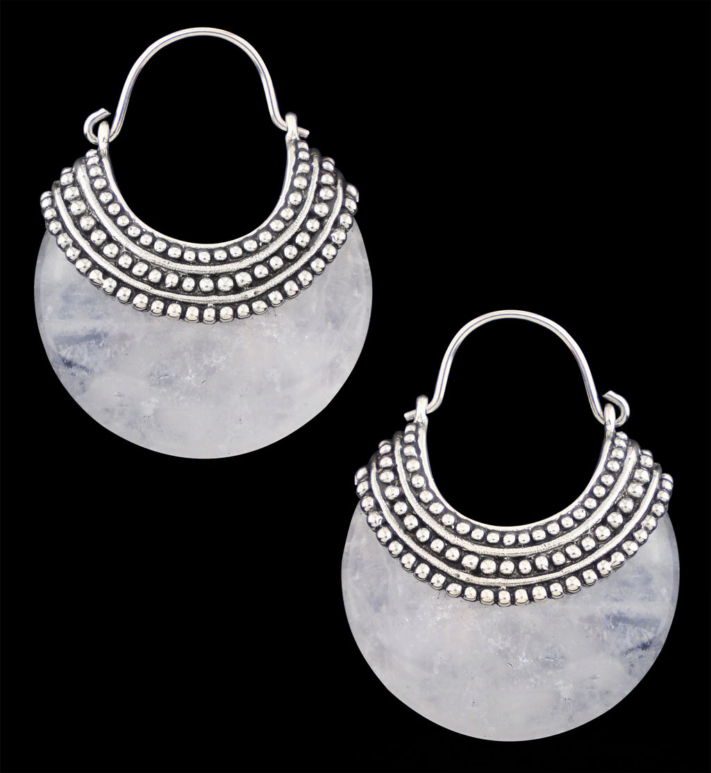 These white brass earrings have a cool design with a natural white quartz stone. Each piece measures 36mm x 30mm, give or take 1-2mm as these are handmade. Each earring weighs about 14 grams. Made from white brass with an astm f136 titanium wire. May oxidize in extreme moisture conditions. Sold in pairs.