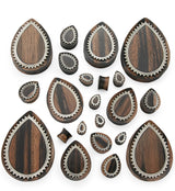 Double flared teardrop plugs made from areng wood with a beaded, white brass ring inlay in the center. Handcrafted and polished. Available in sizes 2G(6mm) - 2" (51mm). Sold in pairs (2 pcs). For healed lobes/piercings.