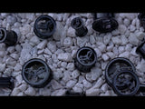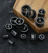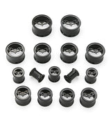Tunnel plugs made from black pvd on 316L stainless steel that have a cut out bat with open wings. These plugs are double flared. Pick from 2G-5/8". Wearable area is about 8mm - 9mm. Full length is 10mm. Sold in pairs (2pcs). For healed lobes.