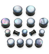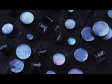 Tunnel plugs made from black pvd on 316L stainless steel that have an iridescent blue/white stone on the front. These plugs are double flared. Pick from 2G-5/8". Wearable area is about 8mm - 9mm. Full length is 12mm (including front convex dome from stone). Sold in pairs (2pcs). For healed lobes.