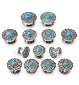 Screw back tunnels plugs with an ornamental design around a synthetic howlite turquoise stone. Made from 316L stainless steel. Available sizes: 2G (6mm), 0G (8mm), 00G (10mm), 7/16" (11mm), 1/2" (12mm), 9/16" (14mm), 5/8" (16mm). Full Length: 12mm X Wearable area: 8mm. Sold in pairs (2pcs).