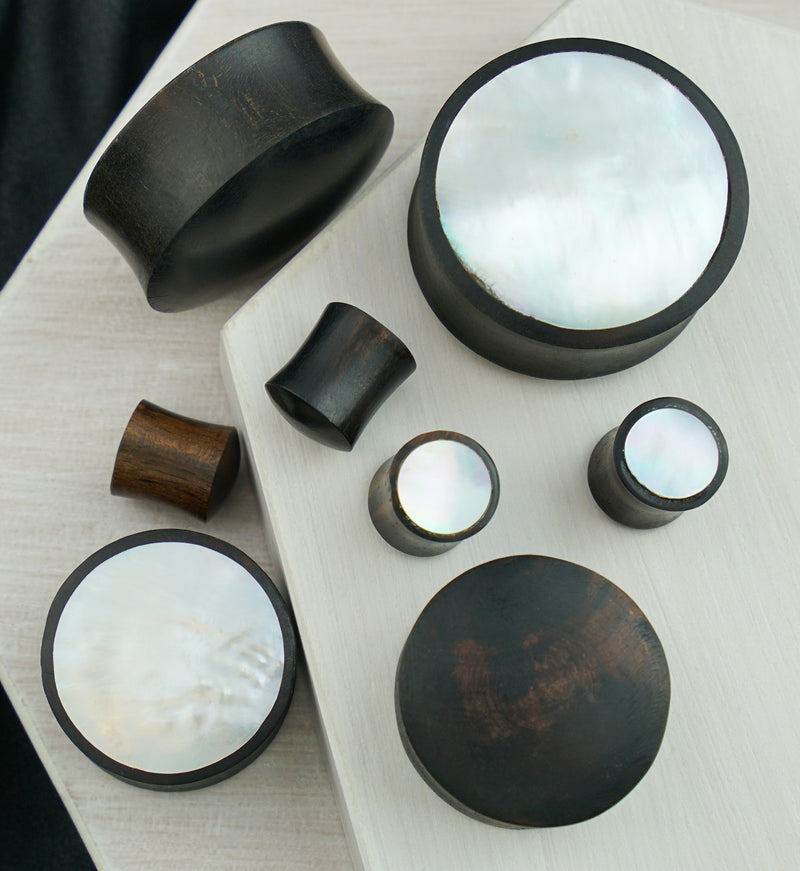 These Areng Wood Plugs with Mother of Pearl Inlay are perfect for healed lobes, with a smooth surface and double flare design for easy insertion. Each pair is handcrafted and unique, with a matching guarantee. Made of durable Areng wood and MOP shell inlay, avoid extreme conditions and do not use for ear stretching.