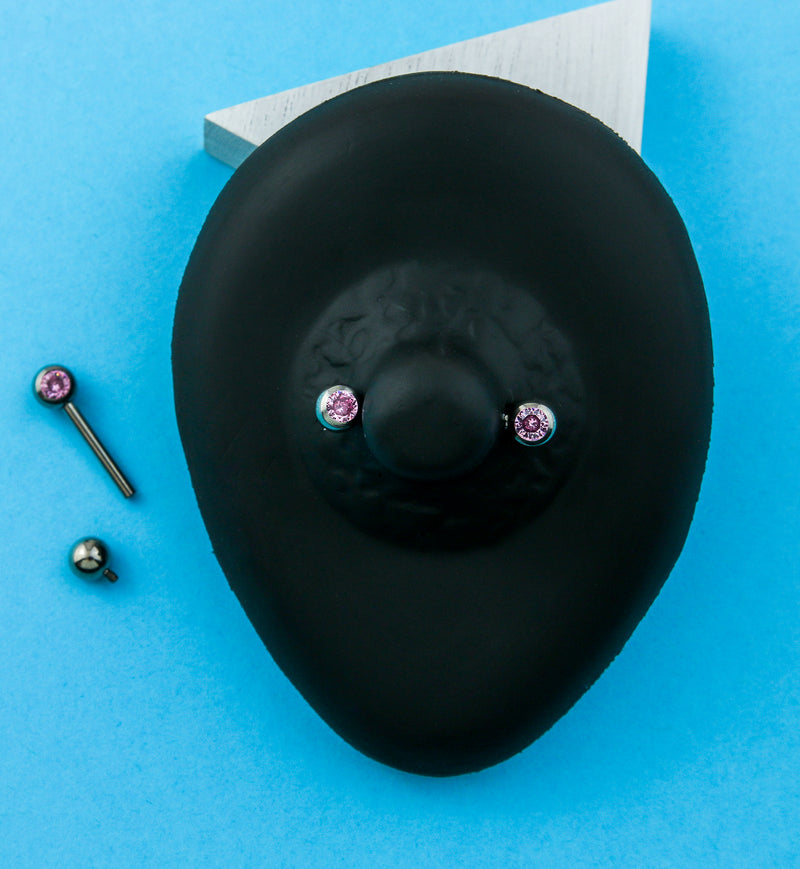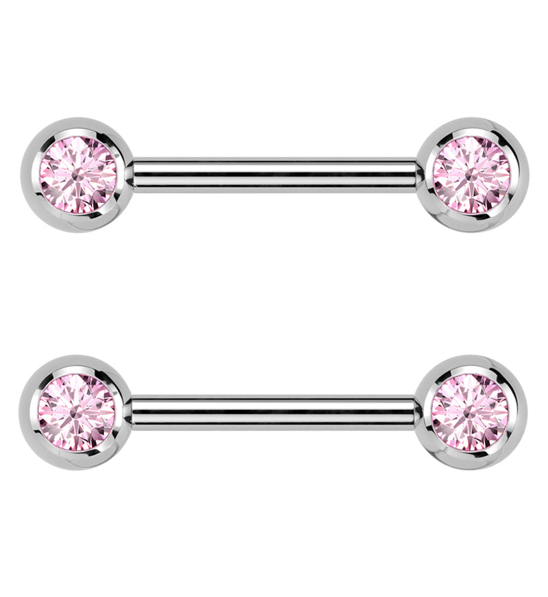 Style your look with our Pink CZ Ball Internally Threaded Titanium Nipple Barbells. Sold in pairs, these 14G barbells are available in lengths of 1/2" (12mm) or 5/8" (16mm) with 5mm or 6mm balls. Our ASTM F-136 Titanium Implant grade ensures both quality and safety, while the pink CZ gems add a touch of shine. Internally threaded for easy wear.