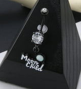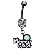 Be one with the moon with this Moon Child belly button ring. Complete with a shining white opalite gem and sparkling clear cz gems. Size is 14G with a 3/8" 10mm barbell. It is made from black pvd on 316L stainless steel. Externally threaded. Moon Child lettering and synthtic white opal measures at about 12mm x 16mm. Top cz gem size is 5mm and bottom cz is 8mm. Sold individually (1 pc). For healed piercings.