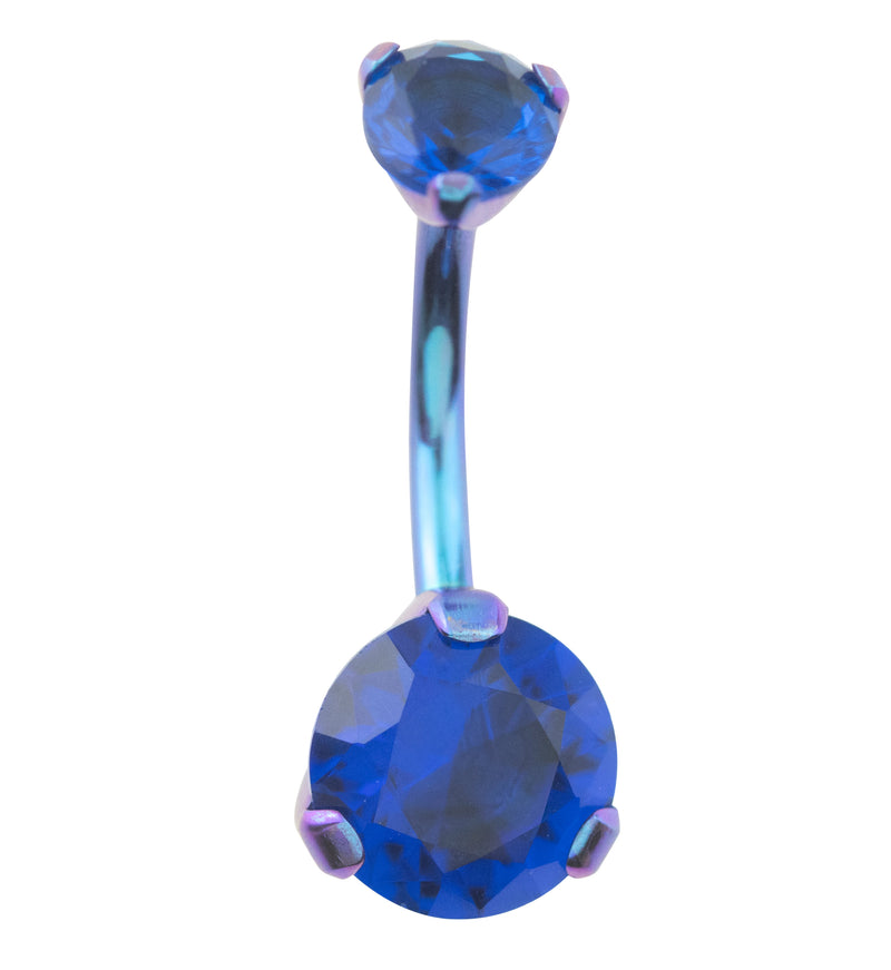 Dark, anodized blurple belly button rings with dark blue cz gems in a three prong set. Made from anodized ASTM F-146 titanium. Internally threaded. Size is 14G with a 3/8" (10mm) length. Gem sizes are 5mm and 8mm. Sold individually. Meant for healed piercings.