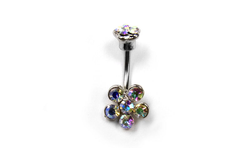 Stunning belly button ring made from rainbow aurora gems. The flower shape is perfect for spring or to add a whimsical element to your look. The rainbow aurora gem will also add some sparkle and an array of colors that change in the sunlight! The barbell is made from 316L stainless steel and a size 14 gauge.