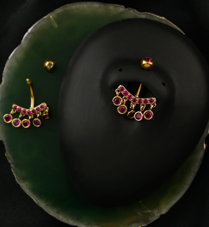 Dangling belly ring that has a curved design filled with fuchsia cz gems and is accented with five, bezel-set, fuchsia cz gems dangling from it. The top cz gem is upward facing, bezel set and fuchsia as well. The belly ring has a length of 3/8" (10mm) and a gauge size of 14G. Overall, the design measures around 20mm x 16mm (including dangles). Made from nice, gold pvd on 316L stainless steel and is externally threaded with M1.2 threading. Meant for healed piercings. Sold individually.