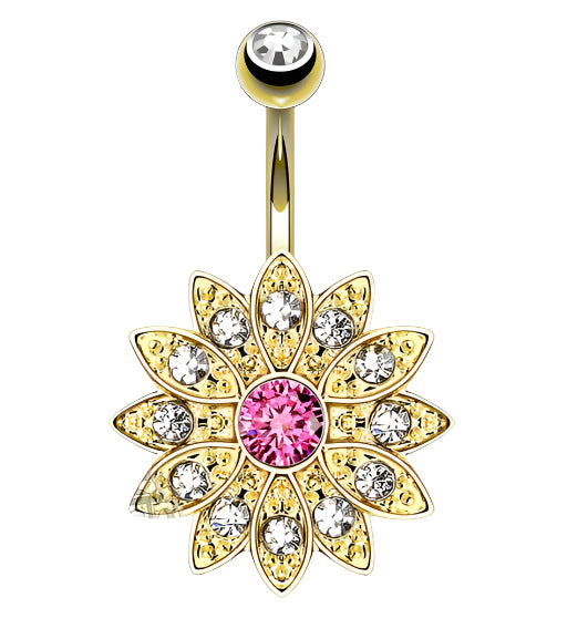 Gold PVD Flower with CZ Gem Belly Button Ring