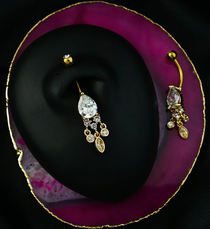 Shimmering belly button ring has a 10mm teardrop clear cz gem at the bottom with attached, dangling gems consisting of two round and one marquise-shaped clear cz gems and a row of accented clear cz gems on top. It has a wearable of 7/16" (11mm) and a gauge size of 14G. Made from gold pvd on 316L stainless steel. It has a 5mm externally threaded clear cz top. For healed piercings. Sold individually (1pc).