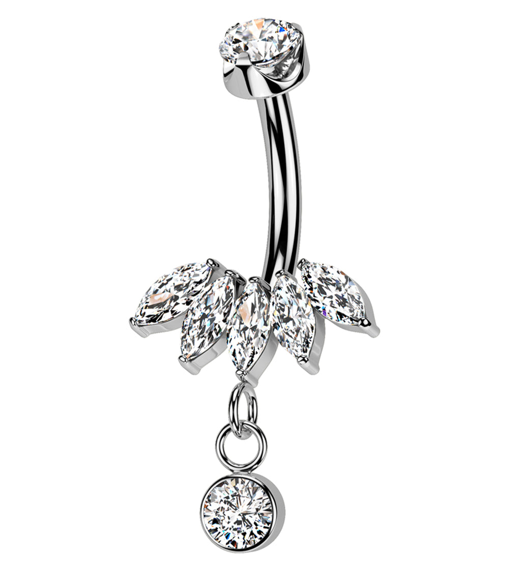 This belly button has a pretty, curved design on the bottom that consists of five, marquise, clear cz gems. It is accented with a dangling, clear cz gem! On top there is a prong set, 4mm clear cz gem. It is made from strong ASTM F-136 titanium. The bottom cz design (including dangle) measures about 15mm x 12mm. It is size 14G and has a wearable of 3/8" (10mm). Sold individually.