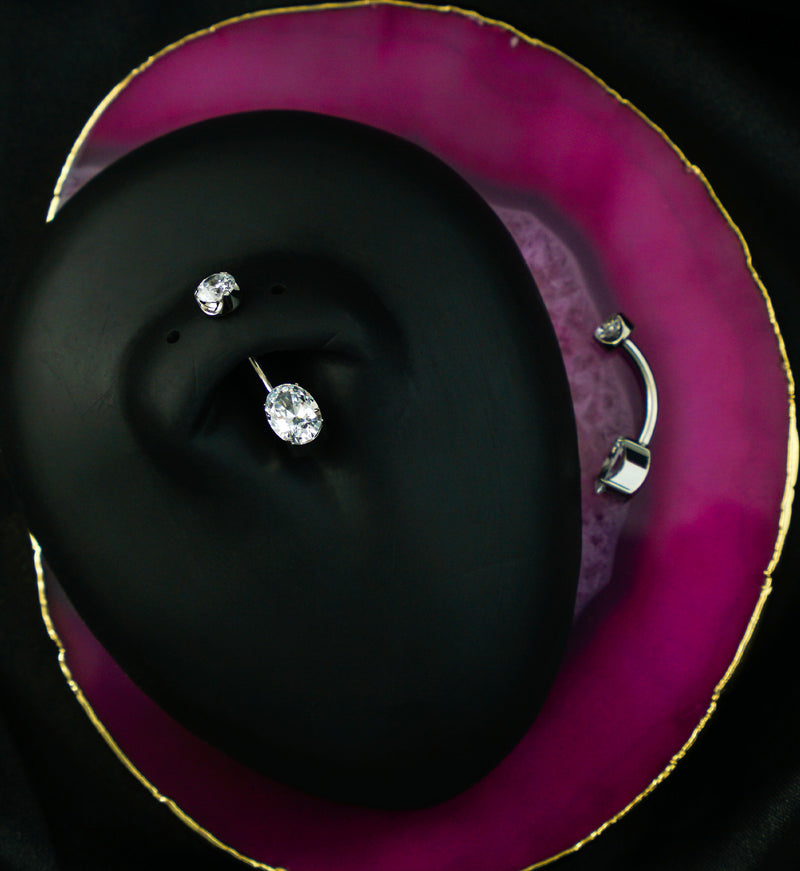 This belly button has an oval-shaped, prong-set, clear cz gem on the bottom that measures about 7mm. On top there is a round, prong-set, 4mm clear cz gem. It is made with ASTM F-136 titanium and has an internally threaded design. It has a wearable area of 3/8" (10mm). Sold individually (1pc).