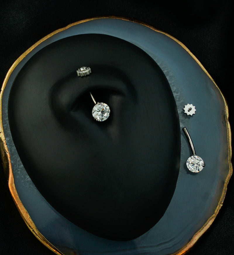 This belly button has a flower shaped top that is filled with pave, clear cz gems. The top measures about 5mm and the bottom, round clear cz gem measures 6mm. It is made with ASTM F-136 titanium and has an internally threaded design. It has a wearable area of 3/8" (10mm). Sold individually (1pc).
