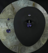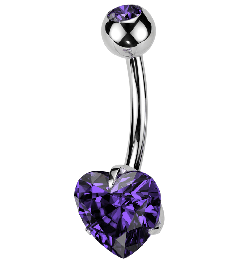 Pretty heart shaped belly button ring made from ASTM F-136 titanium and purple, tanzanite, cz gems. Top cz gem is bezel set and heart cz is prong set. Externally threaded. Size 14G with a 3/8" (10mm) length. Sold individually.
