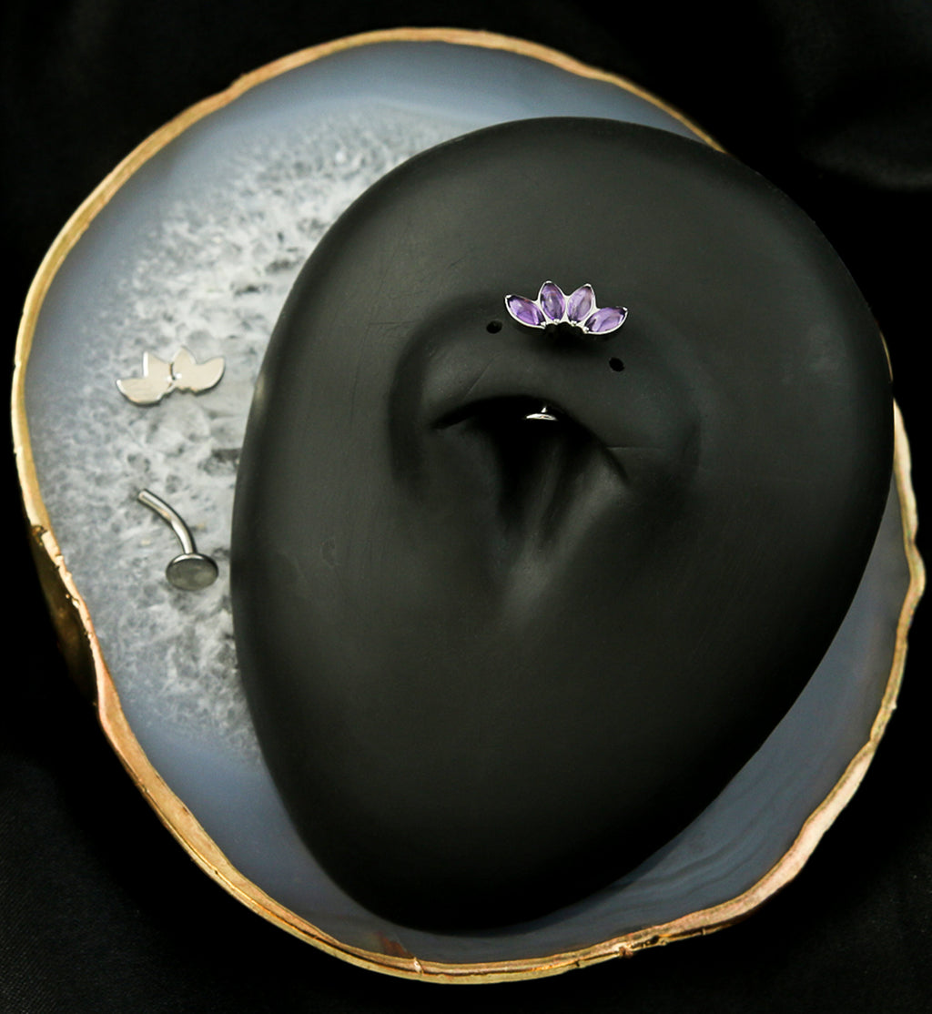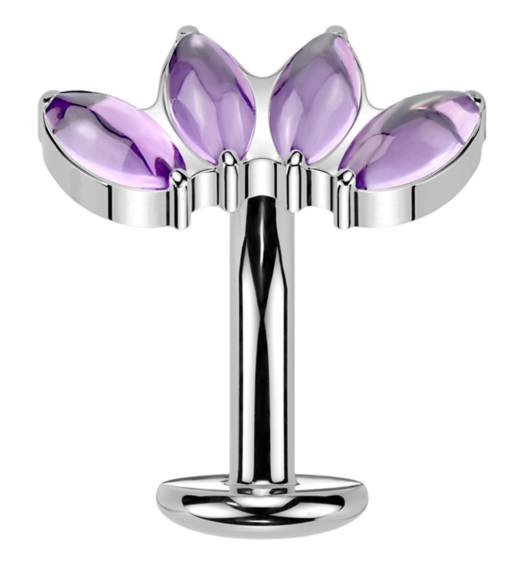 This 14G Amethyst is a fun piece to add to your rotation. It features four synthetic amethyst gems. The top piece measures about 11mm x 5mm.It is made with ASTM F-136 titanium. Has a wearable area of 5/16" (8mm). The threadless push pin closure is secured with an arched. Bottom disc has a 5mm flat disc. Sold individually (1pc). Recommended for healed piercings.
