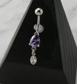 Pretty belly button ring with a teardrop tanzanite cz gem attached to a dangling clear cz gem. Size is 14G with a 3/8" 10mm barbell. It is made from 316L stainless steel. Externally threaded. Top ball measures at about 5mm and bottom is a 8mm teardrop shape. Bottom design is about 14mm. Sold individually (1 pc). For healed piercings.