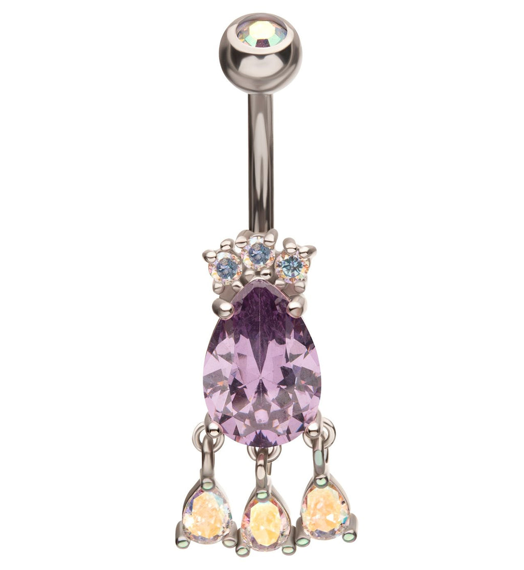 Triple Dangle Teardrop Amethyst And Rainbow Aurora CZ Stainless Steel Belly Button Ring