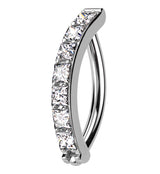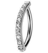 Beautiful, hinged segment ring made from ASTM F-136 titanium with an oval hoop design that has a row of pave-set, square, clear cz gems. Sizes available are 16G and 14G. Inner diameter sizes are 5/16" (8mm) and 3/8" (10mm). The hinged design makes this piece easy to insert and remove. The 16G size is great for cartilage, daith, eyebrow, etc and the 14G size can be used in a navel piercing! 16G size has 7 gems and the 14G size has 8 gems. Sold individually (1pc).