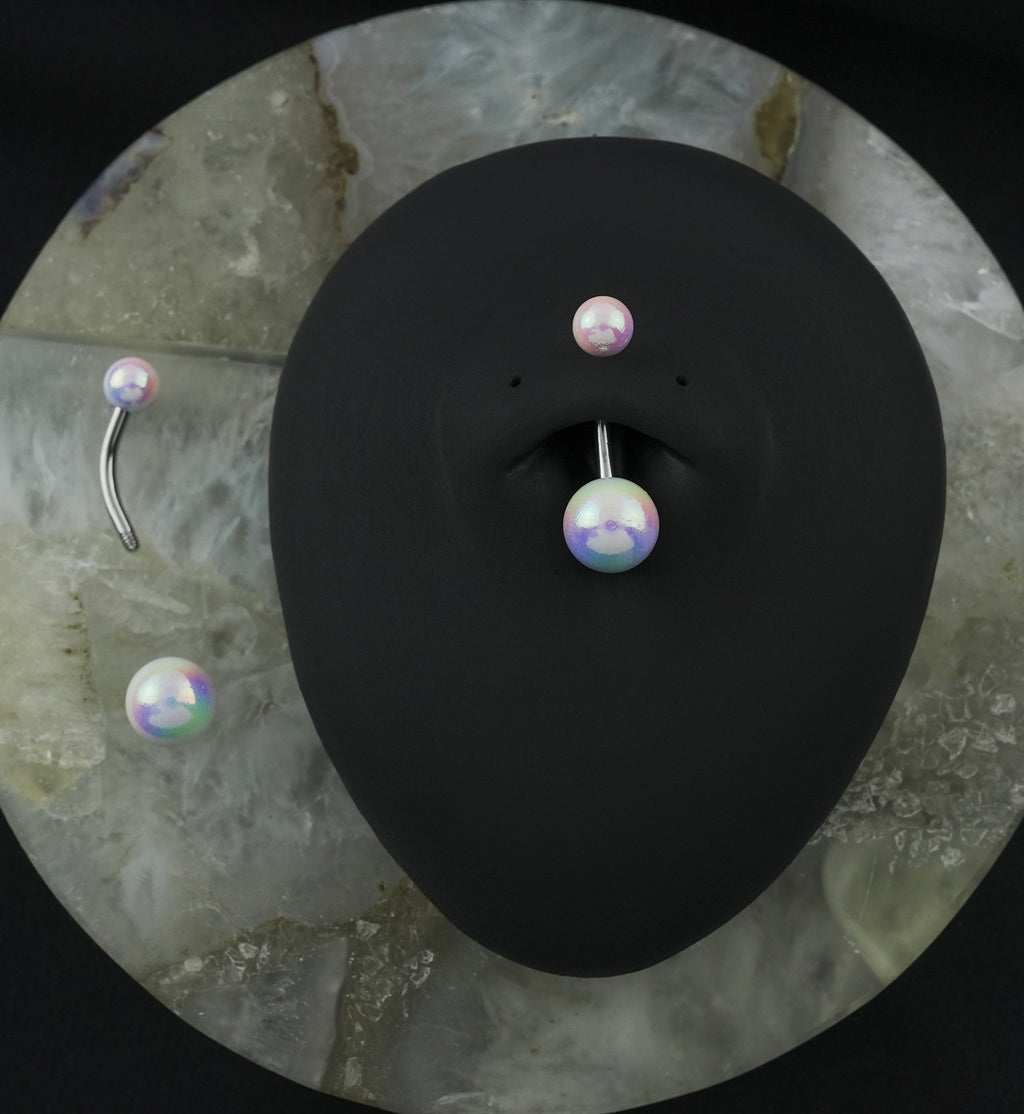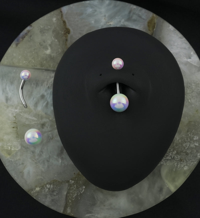 This 14G, 3/8" (10mm) barbell is made of surgical 316L stainless steel and is externally threaded for easy insertion. The white AB coating adds a touch of fun and the ball sizes come in 5mm and 8mm. Add to your healed navel piercing! Sold individually.