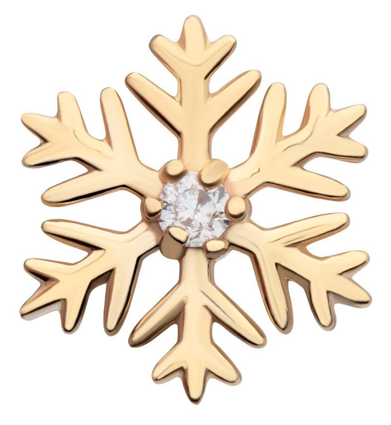 14kt gold threadless top piece that has a 6-prong snowflake that has a centered, clear cz gem. Fits all threadless posts. Made from 14kt nickel-free gold with a 316L stainless steel pin. Top size: 8mm x 7mm. Pin size is 25G. Pin length is approximately 5mm. Sold individually (1pc, top only).