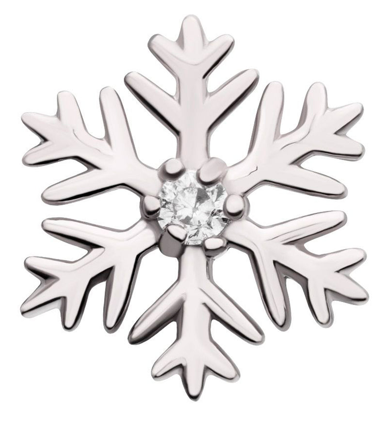 Shimmering 14kt white gold threadless top piece that has a 6-prong snowflake that has a centered, clear cz gem. Fits all threadless posts. Made from 14kt nickel-free white gold with a 316L stainless steel pin. Top size: 8mm x 7mm. Pin size is 25G. Pin length is approximately 5mm. Sold individually (1pc, top only).