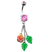 Hibiscus Flower Pink CZ Dangle Stainless Steel Belly Button Ring