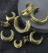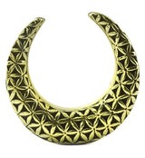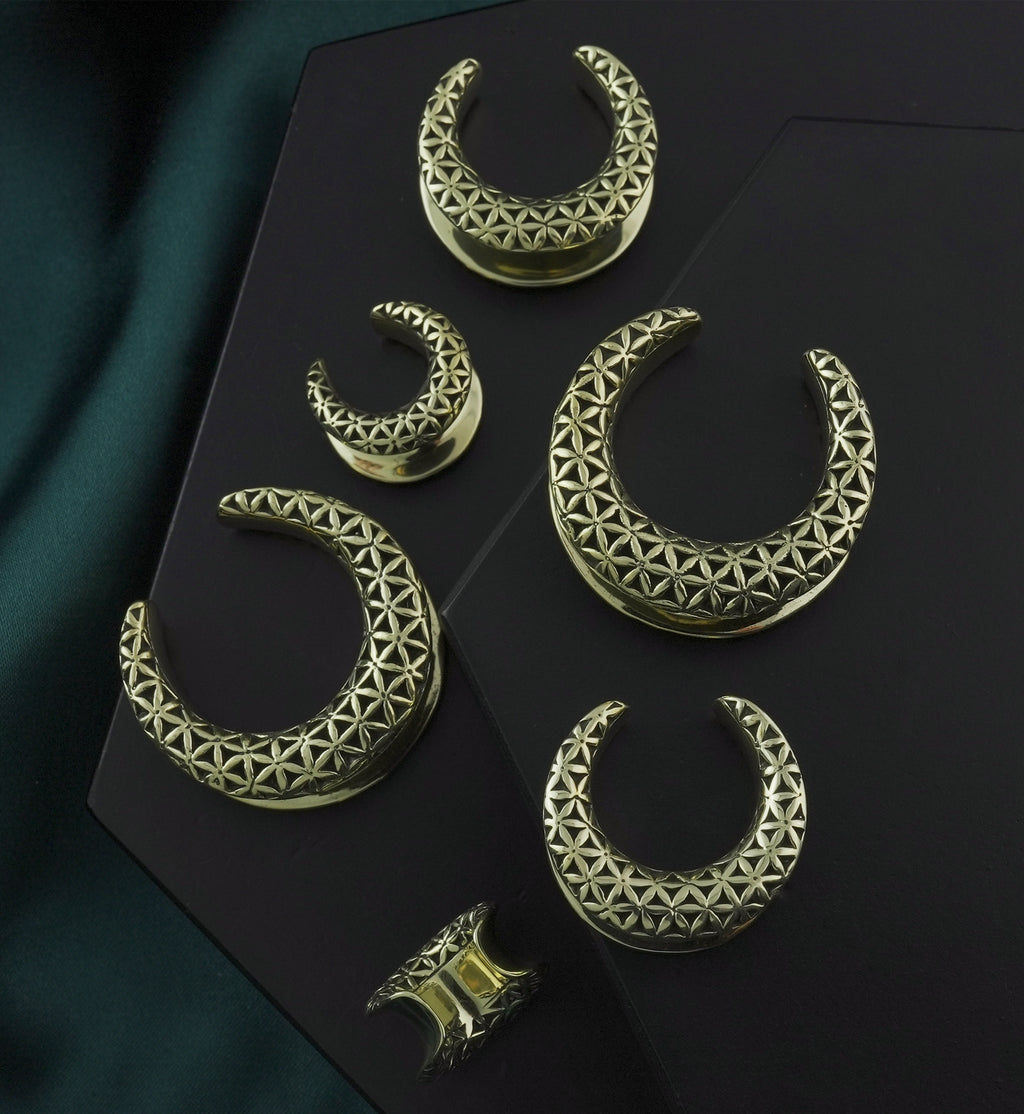 Brass saddles that are durable and great to wear on their own or with ear weights to evenly distribute weight. Decorated with a flower of life design. Available in sizes 0G (8mm) - 1" (25mm). 8mm wearable area. Full length is about 10mm. Brass is not meant for long term wear. May oxidize under extreme moisture conditions. Designed to support stretched ears wearing heavy ear weights / earrings. For healed piercings. Notice: LARGE FLARES. Sold in pairs (2pc).