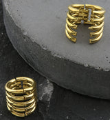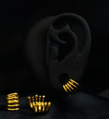 Stainless steel hoop rings with a coil design that do not require opening and closing each and every ring. Simply place along your stretched ears and get the appearance of five stacked rings. Cuff has a hinged design. Measures about 13mm x 10mm. Made from gold pvd on 316L stainless steel. Also available in 10 count. Sold in pairs (2 pieces)