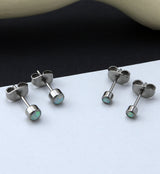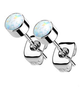 Pretty bezel set titanium earrings with white synthetic opals. Made from ASTM f-136 titanium. Size is 20G. Sold in pairs (2 pieces). Choose from 3mm or 4mm opal size. Great pair of earrings to add to your jewelry collection!