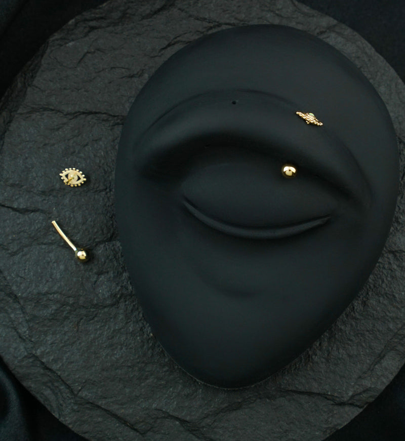 Curved barbells decorated with an evil eye design on top that has a centered, synthetic, white opal gem. The top piece has a threadless design that makes it easy to put in and remove. The top design measures 6mm x 4mm. Made from 14kt yellow gold with a 16G size and an inner length of 5/16" (8mm). Complete with a threadless 3mm ball on the end. Sold individually. Cool jewelry piece for your eyebrow or rook piercings!