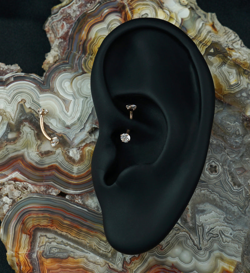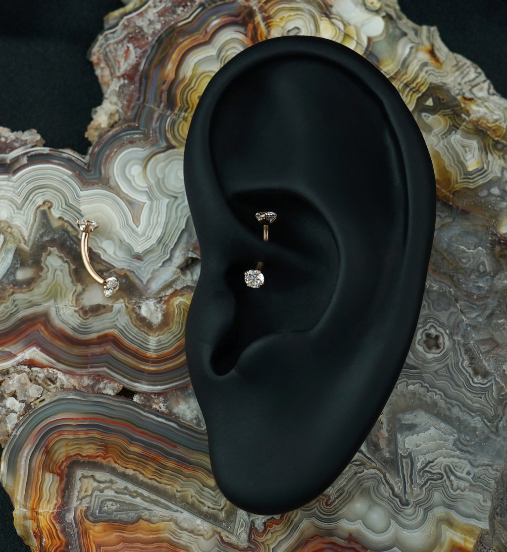 Internally threaded curved barbell made from rose gold PVD on ASTM F-136 titanium and 2 sparkling 3mm cubic zirconia gems in prong sets. Size 16G with a length of 5/16" (8mm). Sold individually. For healed piercings.