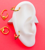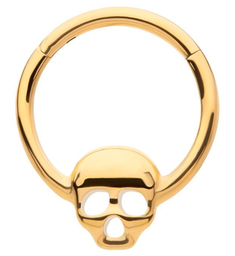 Hinged segment ring made from 24kt gold pvd on ASTM F-136 titanium with a centered, skull head. Size is 16G with an inner diameter size of 3/8" (10mm). The hinged design makes this piece easy to put in and take out. Great piece for cartilage or septum piercings! Sold individually (1pc).