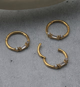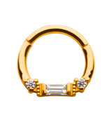 Round & baguette hinged segment ring with pretty cz design. Made from gold PVD on 316L stainless steel. Size is 16G. Choose your diameter size: 5/16" (8mm), 3/8" (10mm). Hinge opens & clicks closed. Sold individually (1 pc). For healed piercings.