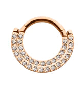 Pretty hinged segment ring made from rose gold PVD on 316L stainless steel and double rows of cz gems. Size is 16G. Choose your diameter size: 5/16" (8mm), 3/8" (10mm). Hinge opens & clicks closed. Sold individually (1 pc). For healed piercings.