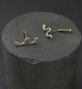 Threadless labret with a snake design on top that is full of clear cubic zirconia gems. Made from 14kt gold. Disk size is 3mm. Choose your gauge: 18G or 16G. Length is 5/16" (8mm). Sold individually (2 pieces - top and bottom). For healed piercings.