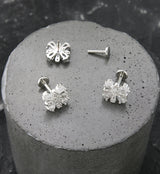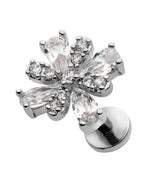 Threadless labret that consists of a flower design with alternating teardrop cz gems and teardrop shapes filled with pave-set clear cz gems. Made from 316L stainless steel. Size is 18G with a 1/4" (6mm) length. 4mm flat back. Top design measures at 9mm x 9mm. Sold individually (1pc).