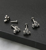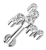 Internally threaded labret piece made of ASTM F-136 titanium with clear cz gems in a spiral, swirling shape. Size is 16G. Choose your diameter size: 1/4" (6mm), 5/16" (8mm). Overall size is 6.5mm x 8mm x .25mm. Sold individually.