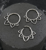 Silver hinged segment ring made from ASTM 136 titanium with a half flower filigree design accented with beads. Size is 16G. Inner diameter sizes are 5/16" (8mm) and 3/8" (10mm). Hinge opens and clicks closed. Sold individually (1pc).
