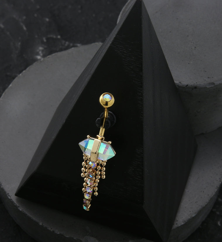 Gold PVD Rainbow Aurora Crystal Bead Chain Stainless Steel Belly Button Ring
