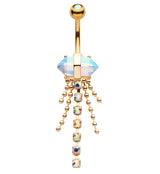 Rainbow belly button ring with a bezel set rainbow aurora cz gem on top and a rainbow aurora crystal as the bottom piece. Attached is a chain of prong set rainbow cz gems and beaded accent chains on either side. Size is 14G with a 3/8" (10mm) barbell. It is made from gold pvd on 316L stainless steel. Externally threaded. Top gem measures at about 5mm. Bottom gem is about 14mm x 6mm. Total length is about 50mm. Bottom chain design length: 30mm. Sold individually (1 pc). Recommended for healed piercings.