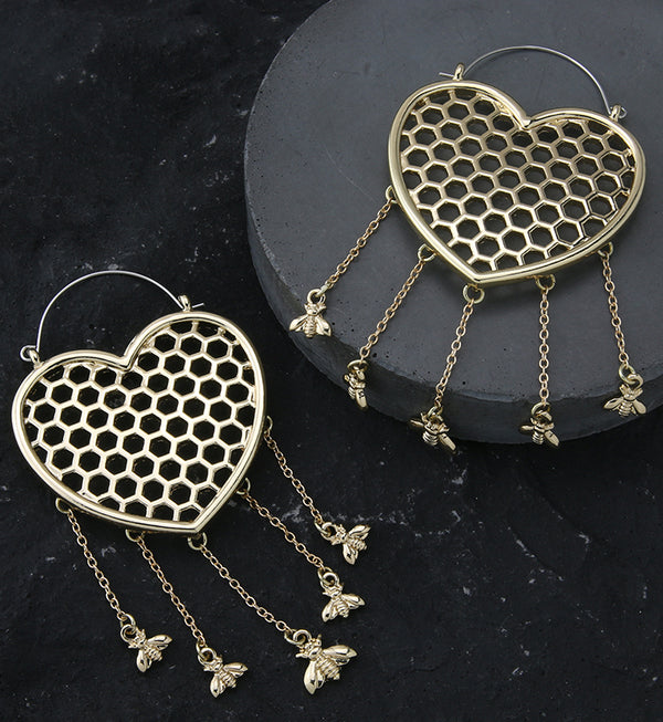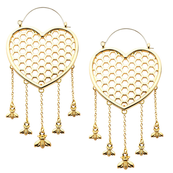 Golden Heart Honeycomb Dangle Bee Stainless Steel Plug HoopsGold PVD Heart Honeycomb Dangle Bee Stainless Steel Plug Hoops