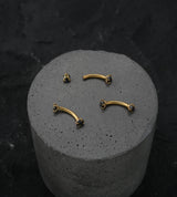Golden curved barbell made from gold pvd on 316L stainless steel and two prong set black cz gems on the ends. Internally threaded with 3mm gems. The length is 5/16" (8mm) with a 16G size. Cool piece to add to your jewelry collection! Sold individually (1pc).