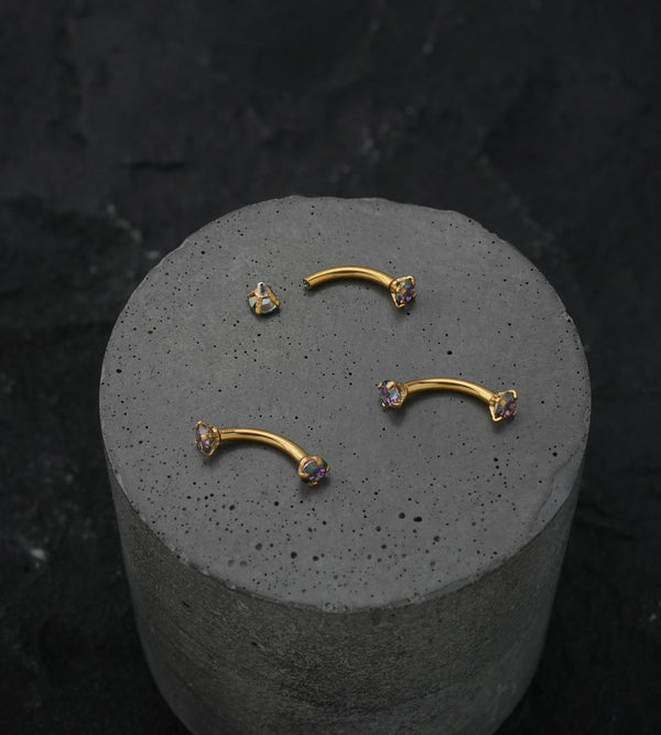 Rose Gold PVD Rainbow Aurora CZ Prong Set Stainless Steel Curved BarbellRose Gold PVD Rainbow Aurora CZ Prong Set Stainless Steel Curved Barbell