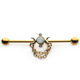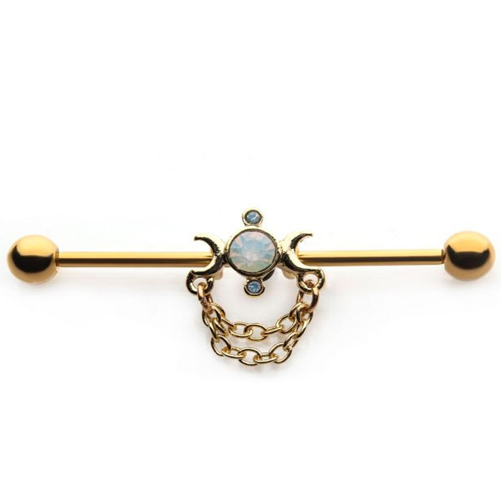 Gold PVD Crescent Moon & Opalite Chained Industrial Barbell