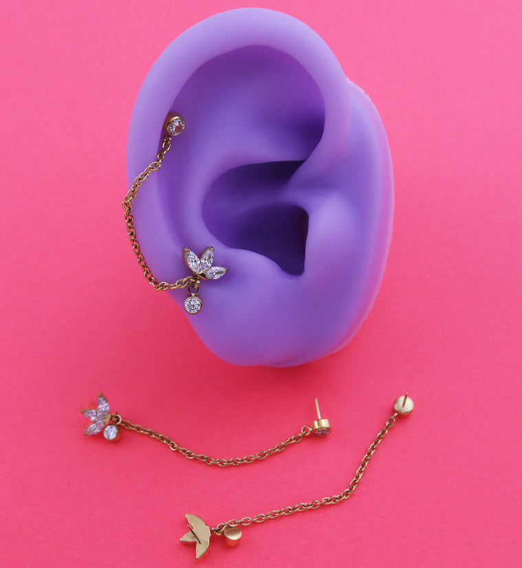 Jewelry chain with a rolo style that connects two clear cz gem threadless tops. One of the tops is a triple marquise clear cz gem design with an attached round cz gem. Connect two piercings with this dangling chain! Made from 24kt gold pvd on ASTM F-136 Titanium. Perfect for ear curation! Length is 43.4mm with a width of about 6.9mm. Sold individually (1pc).